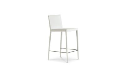 Upholstered entirely in split leather, the Alex stools feature multiple leather pieces on the back exterior, made with two lines of edge-to-edge stitching. Two versions are available: fixed or up-and-down with gas piston.