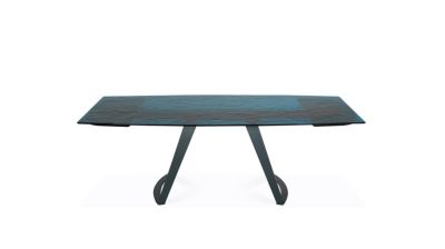 The round base gives center stage to the impressive annealed glass top: with its textured bottom and shimmering surface in a clear, in either Bronze or Bleu color, it feels like dining on a piece of water.