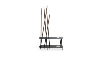 An entry console and coat rack, Mikado is a practical piece. Arranged asymmetrically, five rods intersect with two trays, offering spaces to hold hats, towels and shoes, along with a basin to catch umbrella water droplets.